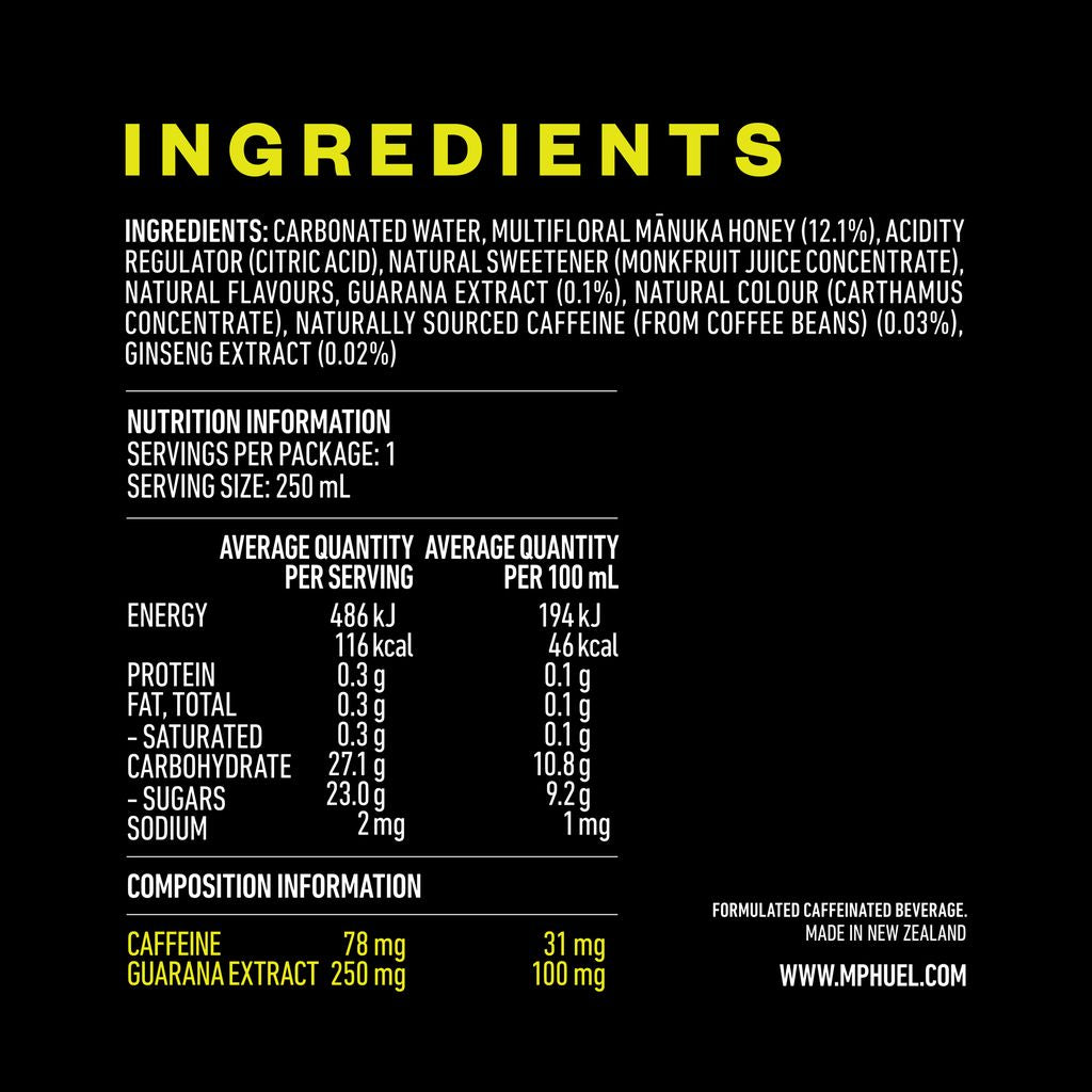 Carbonated water, multifloral Manuka honey (12.1%), acidity regulator (citric acid), natural sweetener (monkfruit juice concentrate), natural flavours, guarana extract (0.1%), natural colour (carthamus concentrate), naturally sourced caffeine (from coffee beans) (0.3%), ginseng extract (0.02%)